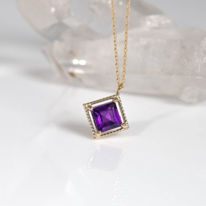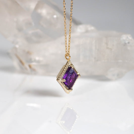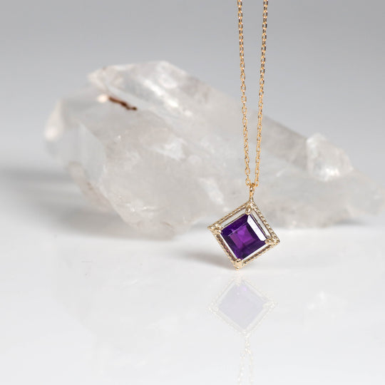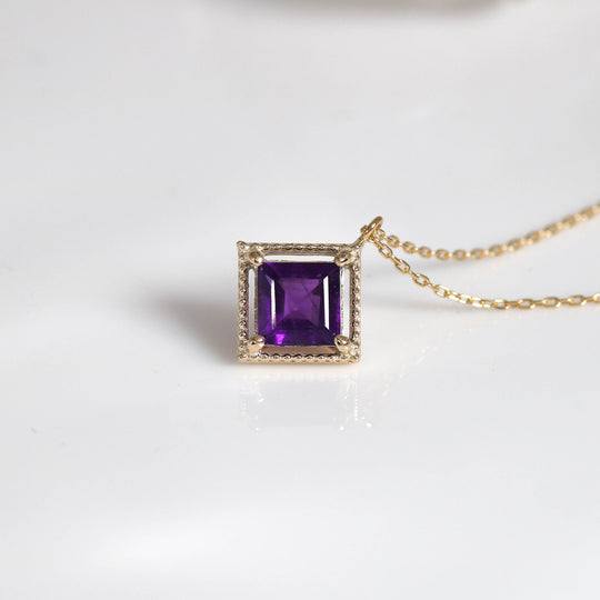 スクエアカットのアメジストを繊細なミル打ちで囲み、上品で洗練された輝きを引き立てるオーダーメイドネックレスです。