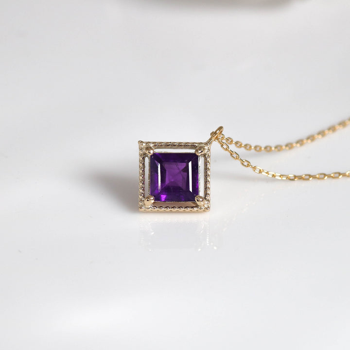 This custom-made necklace features a square-cut amethyst delicately framed with milgrain detailing, highlighting its elegant and refined sparkle.